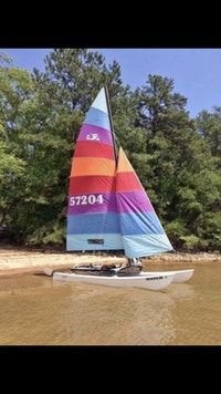 Boat is complete and sails asking 1750. 16 foot hobie cat complete and sails. 14 foot hobie cat catamaran for sale.